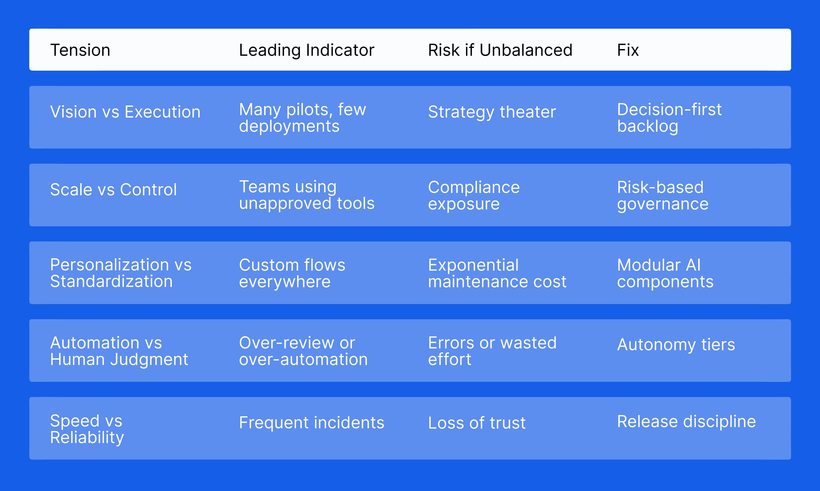Across industries, five recurring tensions define the state of AI maturity in 2025. They’re not roadblocks but design constraints: predictable trade-offs that every organization must navigate.